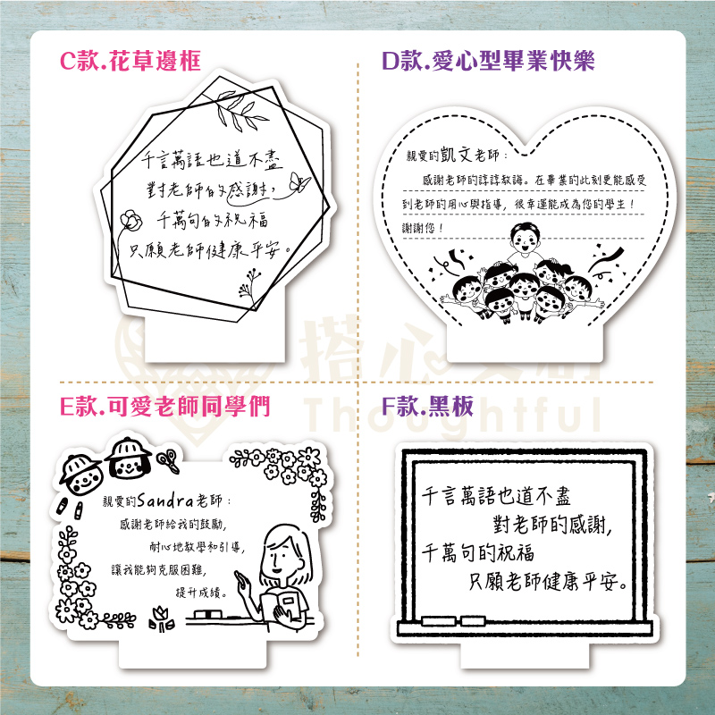 ▪️內容: A款-學生祝福、B款-花束、C款-花草邊框、D款-愛心型畢業快樂、E款-可愛老師同學們、F款-黑板